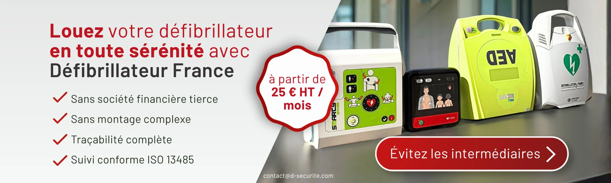 Une gamme complète de 5 différentes marques de défibrillateurs couvrant tous vos besoins avec des packs sur mesure : à l’achat dès 899 € HT ou à la location à 1 €/jour. Et dans le cadre de votre contrat de maintenance vos consommables sont remplacés gratuitement en cas d’usage thérapeutique.